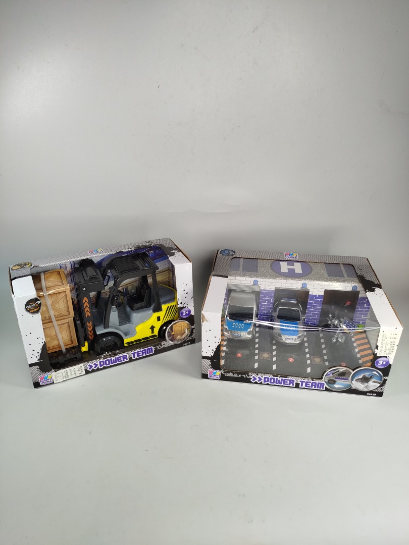 Dieses Power Team Spielset besteht aus zwei spannenden Sets: einem Gabelstapler mit Ladung und einer Polizeistation mit Fahrzeugen. Der Gabelstapler ist mit beweglichen Teilen ausgestattet und kann die beiliegende Kiste transportieren. Die Polizeistation enthält drei Einsatzfahrzeuge und eine detailreiche Szenerie für actiongeladene Einsätze. Ein ideales Set für kleine AbenteurerInnen, die sich in verschiedene Rollenspiele vertiefen möchten.